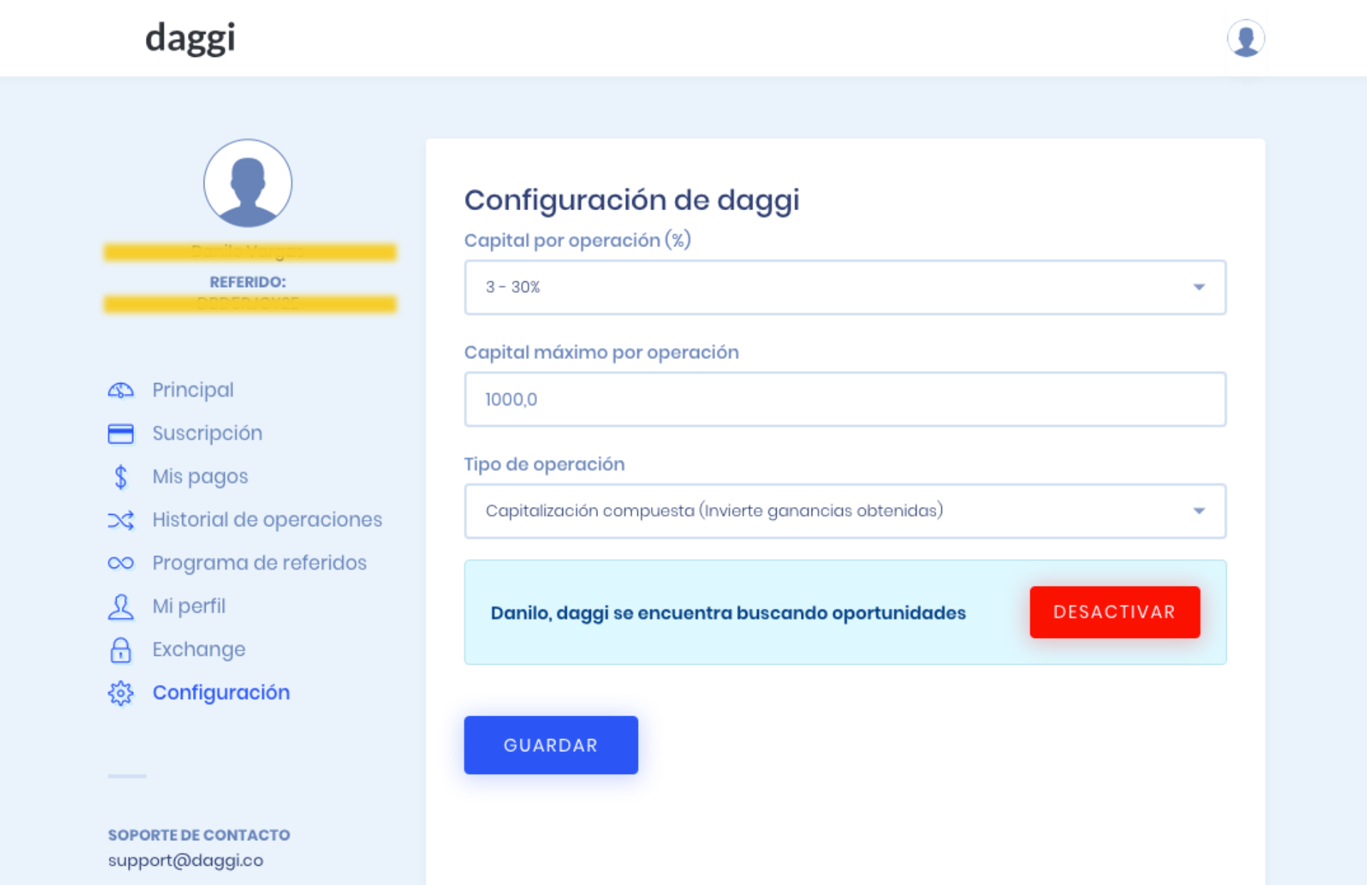 Una vez que haya agregado Binance, puede cambiar la configuración de operación de daggi